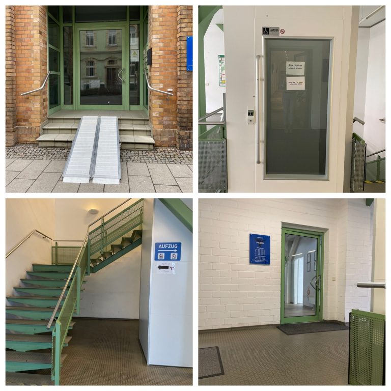 Am Haupteingang gibt es neben den Treppen eine separate Rampe für Rollstuhlfahrer. Zusätzlich steht Ihnen im Innenbereich ein Fahrstuhl zur Verfügung.